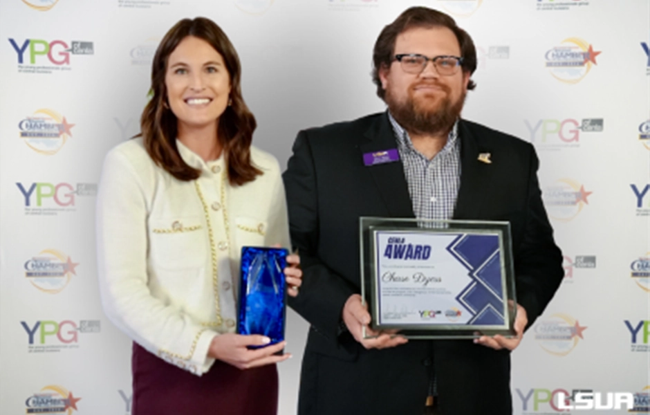 The Central Louisiana Regional Chamber of Commerce and the Young Professionals Group of Cenla (YPG) have announced the 2023 class of CENLA 4WARD and Central Louisiana's "4 Under 40" award winners. LSUA Vice Chancellor of Student Engagement Abbey Bain and Marketing Coordinator Chase Dyess were both honored at this year's event.