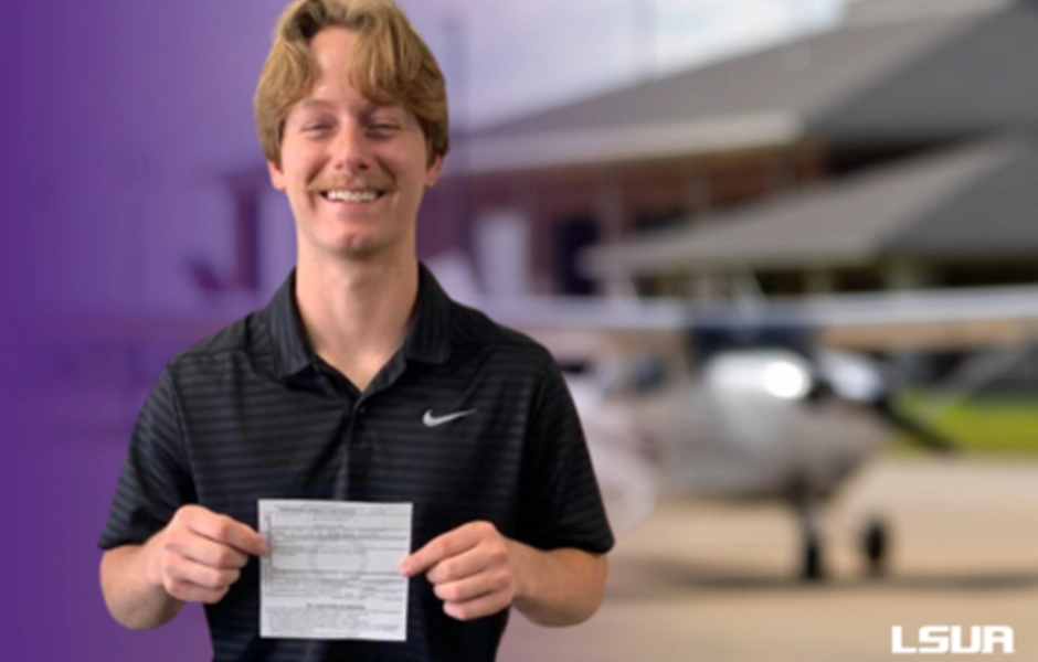 Louisiana State University of Alexandria (LSUA) proudly announces that Nathan Blackwell has become the first student in its Professional Aviation program to earn a private pilot license.